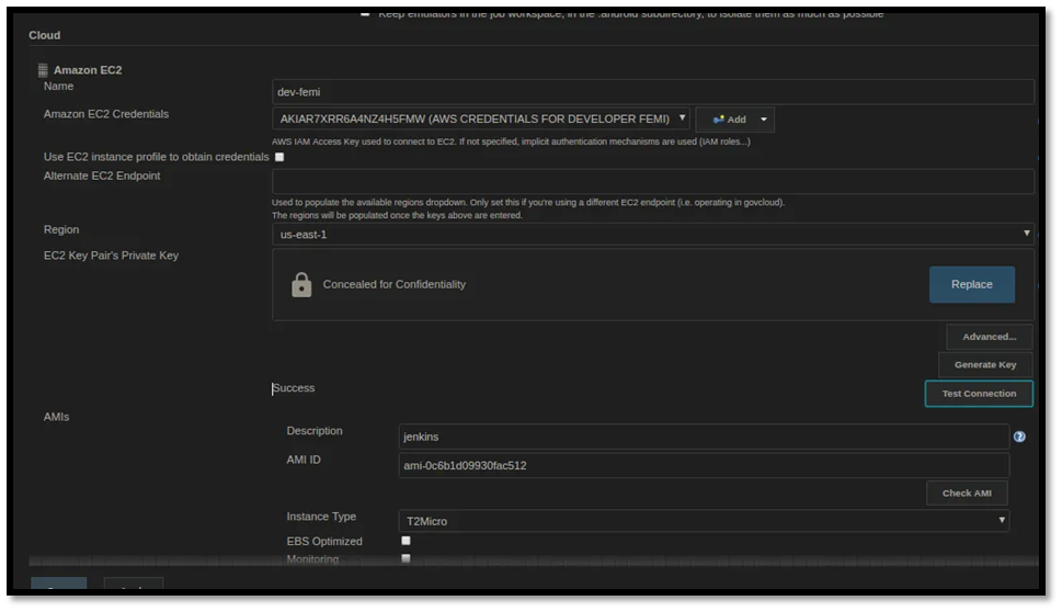 Next, configure the EC2 connection details inside Jenkins. Start by entering the same name you used for your AWS user so everything stays consistent. For the Amazon EC2 credentials field, click Add, choose the Jenkins credentials provider, then select AWS Credentials as the kind and paste in your Access Key ID and Secret Access Key. Give this credential a clear name so you can recognize it later and save it. You also need the EC2 key pair’s private SSH key (an RSA key) so Jenkins can connect to the instance. You can either generate this key pair in AWS using the AWS CLI, or create an SSH key locally and upload the public part to AWS, following the official AWS, CloudBees, or GitHub SSH key guides. Once you have the RSA private key, copy it into the appropriate field in Jenkins and click Test Connection to confirm that Jenkins can successfully reach your EC2 instance.