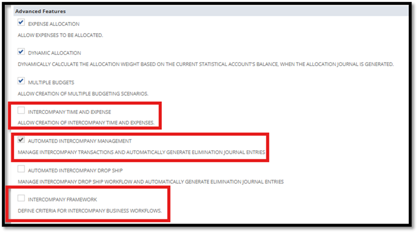 In NetSuite, the "Enable Features" section (under Setup > Company > Enable Features) includes several distinct intercompany options that manage how subsidiaries interact. The primary differences lie in the scope of automation-ranging from basic manual to fully automated to specialized transactional workflows