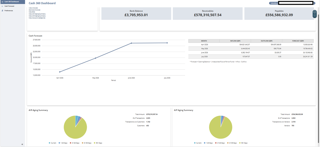 The Cash 360 dashboard lets you quickly view the total receivables, total payables, total bank balance, and cash forecasts for your company. This dashboard also has links where you can access records, transactions, and reports. Aging summary pie charts are also available for accounts receivable and accounts payable.