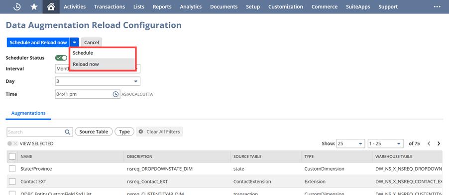 - Hover over the Schedule and Reload now button, then choose Schedule to set up future reloads with the parameters specified in step 4 or Reload now to initiate an immediate data reload. This starts a full data transfer for all the custom and supplemental fields you've selected.