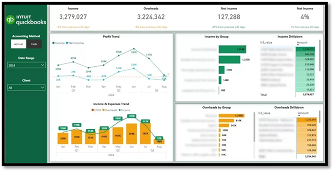 Our financial dashboard template displays monthly trends for Income, Overheads, and Net Income, providing business owners with an instant overview of financial performance over time. Income and overheads are dissected by account and individual transactions, making it easy to understand the factors influencing each figure. Users can toggle between accrual and cash accounting, filter by client (for businesses using multiple QuickBooks accounts), and analyze results by category.