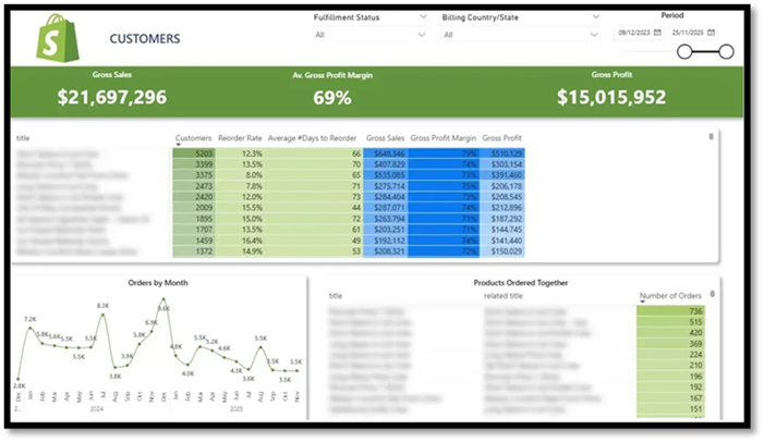 The dashboard summarizes product-level performance, showcasing customer purchase frequency, reorder behavior, and average time between purchases. Selecting a product allows dynamic filtering of monthly order trends, making it easy to identify growth patterns and seasonal changes. The dashboard also highlights frequently purchased items together, fostering informed upselling, bundling, and merchandising decisions. As a result, our client automated upsell suggestions at checkout and initiated reorder reminders based on average repurchase timelines, leading to increased revenue per customer and better long-term retention.