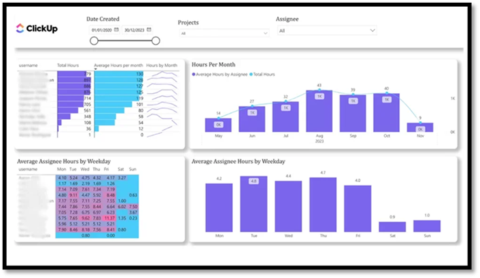 Our team created a free project management template that assesses the effectiveness of resource allocation based on logged hours. It represents total hours and averages per assignee, with views segmented by day and month, across all projects or a specific workspace.
