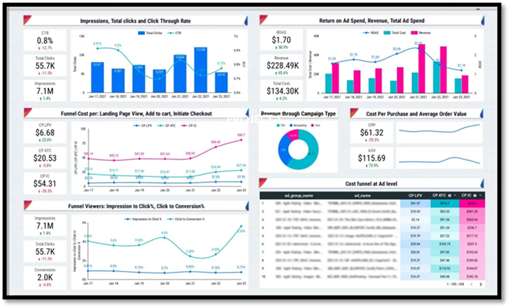 Our marketing analysts designed a dashboard that illustrates how effectively Facebook Ads engage users from impression through to purchase. It tracks ad spend alongside revenue, ROAS, impressions, clicks, and conversion rates at each step of the funnel.