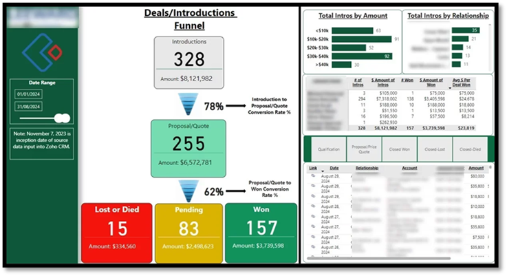 We assisted a financial services company in visualizing their Zoho CRM data through Power BI, utilizing an automated connector for near real-time updates. Our dashboard emphasized deal sources, funnel conversion rates, average deal size, and account manager performance. This enabled the client to uncover bottlenecks in their B2B sales process, prioritize high-quality leads, and enhance forecasting through live CRM data instead of static reports.