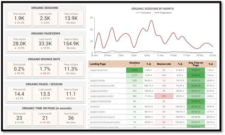 It includes page-level analyses for sessions, bounce rate, and average time on page, determining which content brings in traffic but fails to engage effectively. Daily trend charts help clients identify growth patterns and sudden drops, allowing them to swiftly rectify SEO issues and prioritize content enhancements that improve organic conversions.