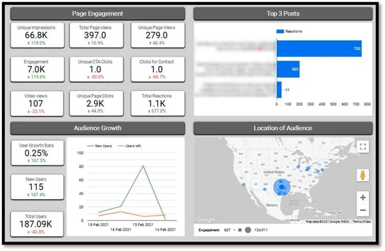 Our BI experts designed a Looker Studio social media dashboard that tracks impressions, clicks, reactions, and total engagement, highlighted by the top three posts based on reactions. This focus simplifies identification of the content types and topics that generate the strongest audience interactions.
