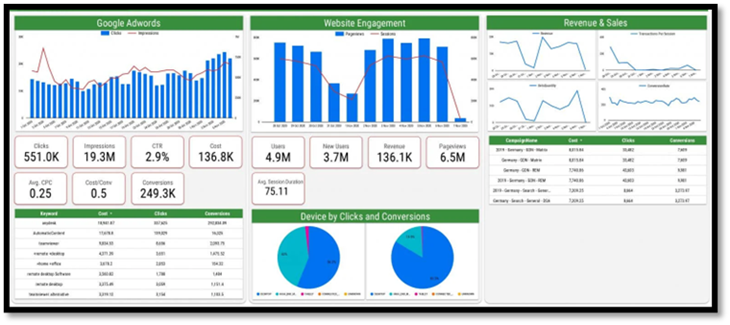 A Google Ads dashboard allows businesses to understand how paid search efforts translate into website engagement and sales. By merging ad performance with website behavior, it offers a comprehensive view of campaign effectiveness.